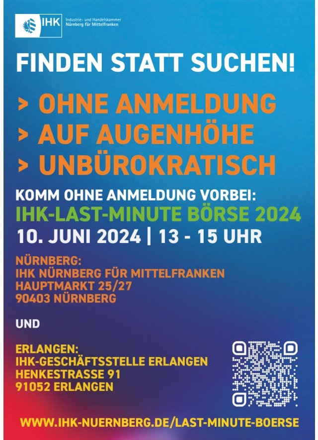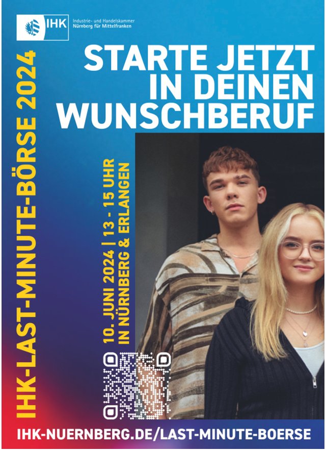 Am 10. Juni 2024 können sich alle Jugendlichen, die noch für dieses Jahr eine Ausbildung suchen, bei vielen Betrieben in Erlangen erkundigen und bewerben. Wann: 10. Juni 2024, 13 – 15 Uhr Wo: IHK-Geschäftsstelle Erlangen | Henkestraße 91 | Eingangsbereich | 91052 Erlangen Alle Informationen auf der Homepage der IHK: www.ihk-nuernberg.de/last-minute-boerse